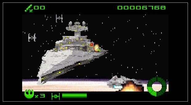 The next level, if you can make it past the endless spawn of Tie Fighters, has you riding a speeder bike through Mos Eisley. The graphics are again in a limited 3D engine, as you try to desperately steer left and right to avoid the incoming walls. The terrible flying controls of the first level are now being put to the test in a proper 3D space, and I've never been able to get past it.