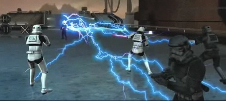 Another new twist on Force powers is the ability to link Force powers together with lightsaber moves and even with other Force powers. For example Force lightning could be combined with Force repulse to create a wave of power that sends all nearby enemies flying whilst shocking them with Force lightning. If Force push is combined with Lightsaber throw then the Apprentice throws his Lightsaber into an enemy and sends them flying into an object. Also Starkiller can send a jolt of Force lightning through his lightsaber that is deadly to small enemies such as stormtroopers, Rodians, and Felucians. But, also the strike can momentarily stun larger enemies such as Rancors, Dark troopers, and AT-STs.